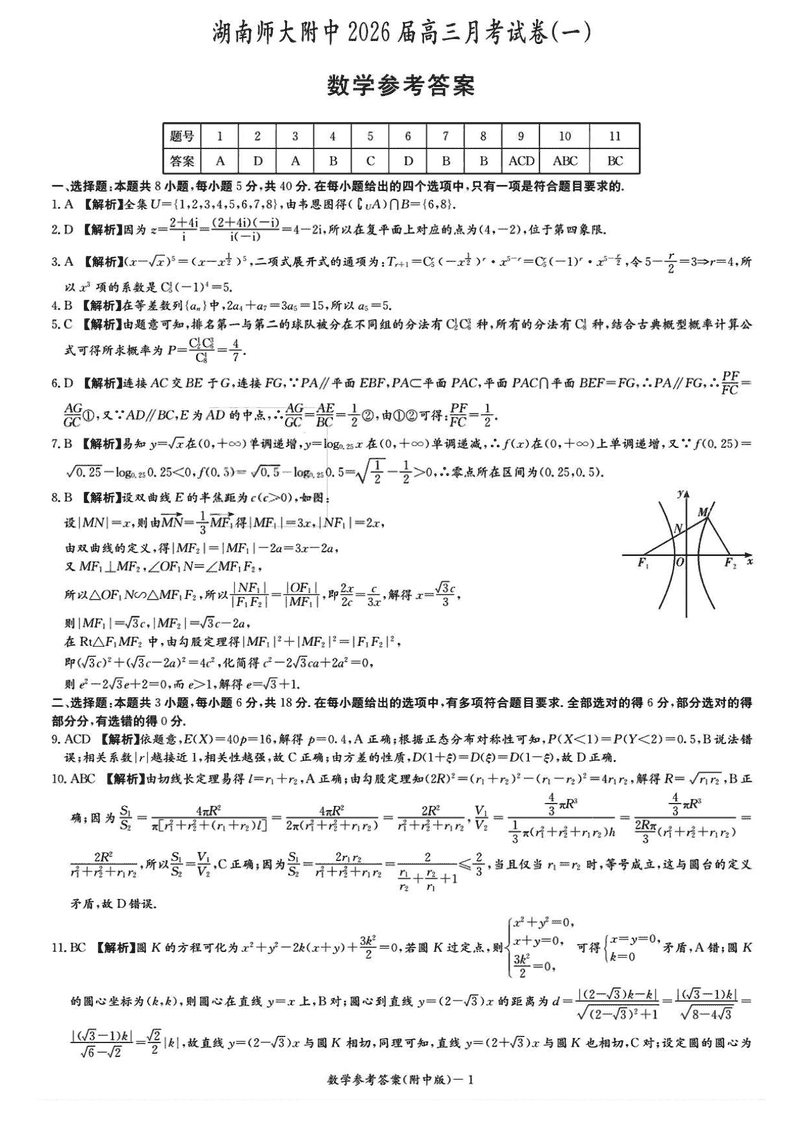 湖南师大附中2026届高三上学期8月月考(一)数学考试已于近日开考,为方便考生考后及时查看考试情况,查漏补缺、弥补不足,本文整理了试题答案解析相关信息!