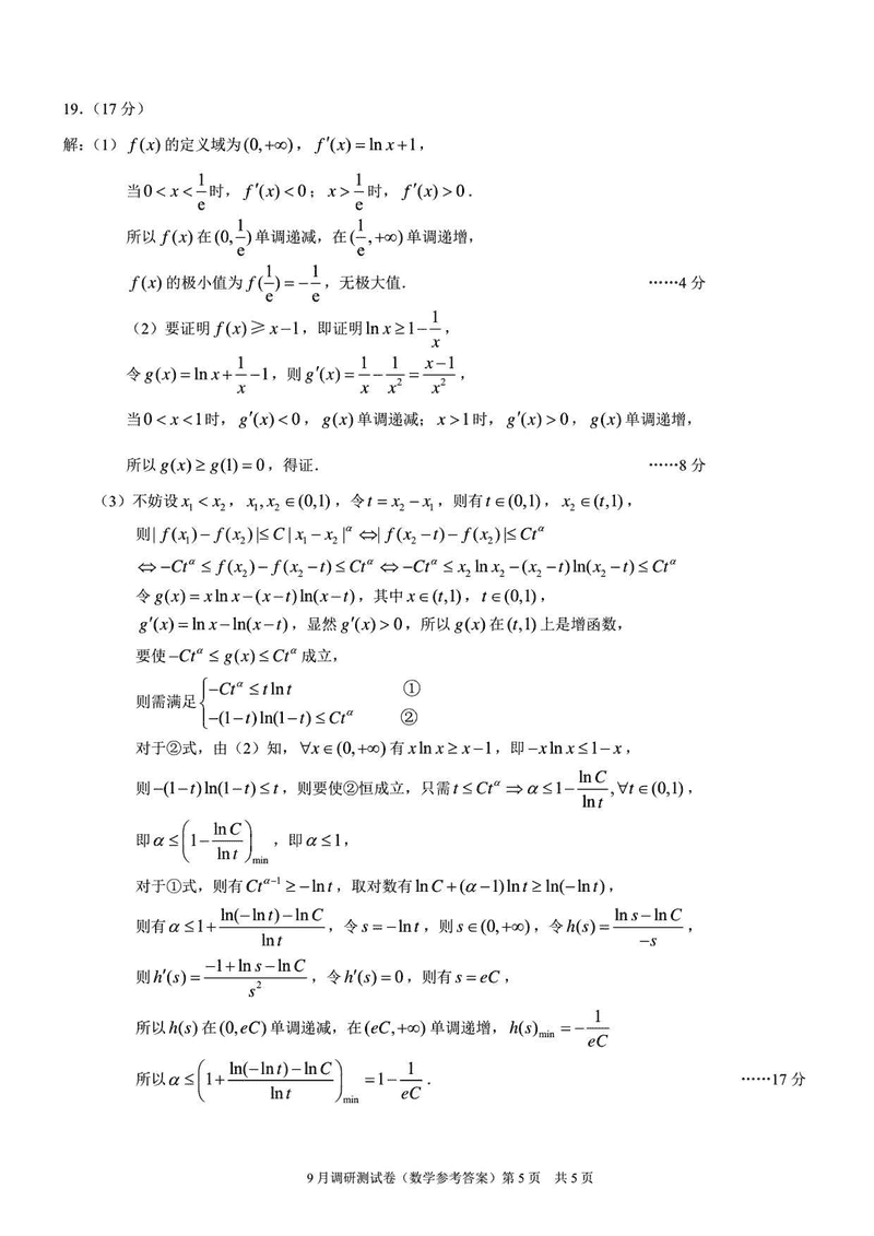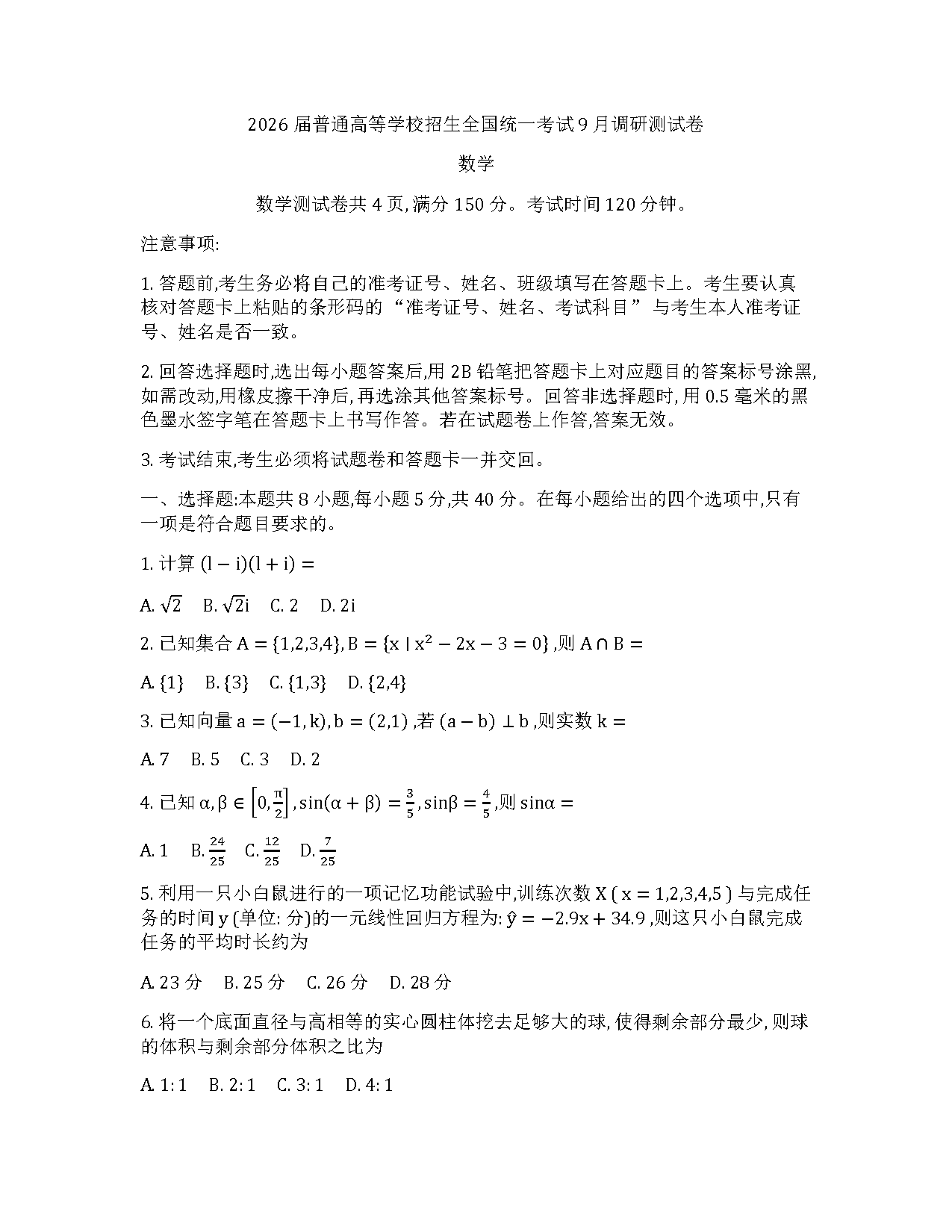 重庆康德卷2026年高三上学期9月调研数学试题及答案