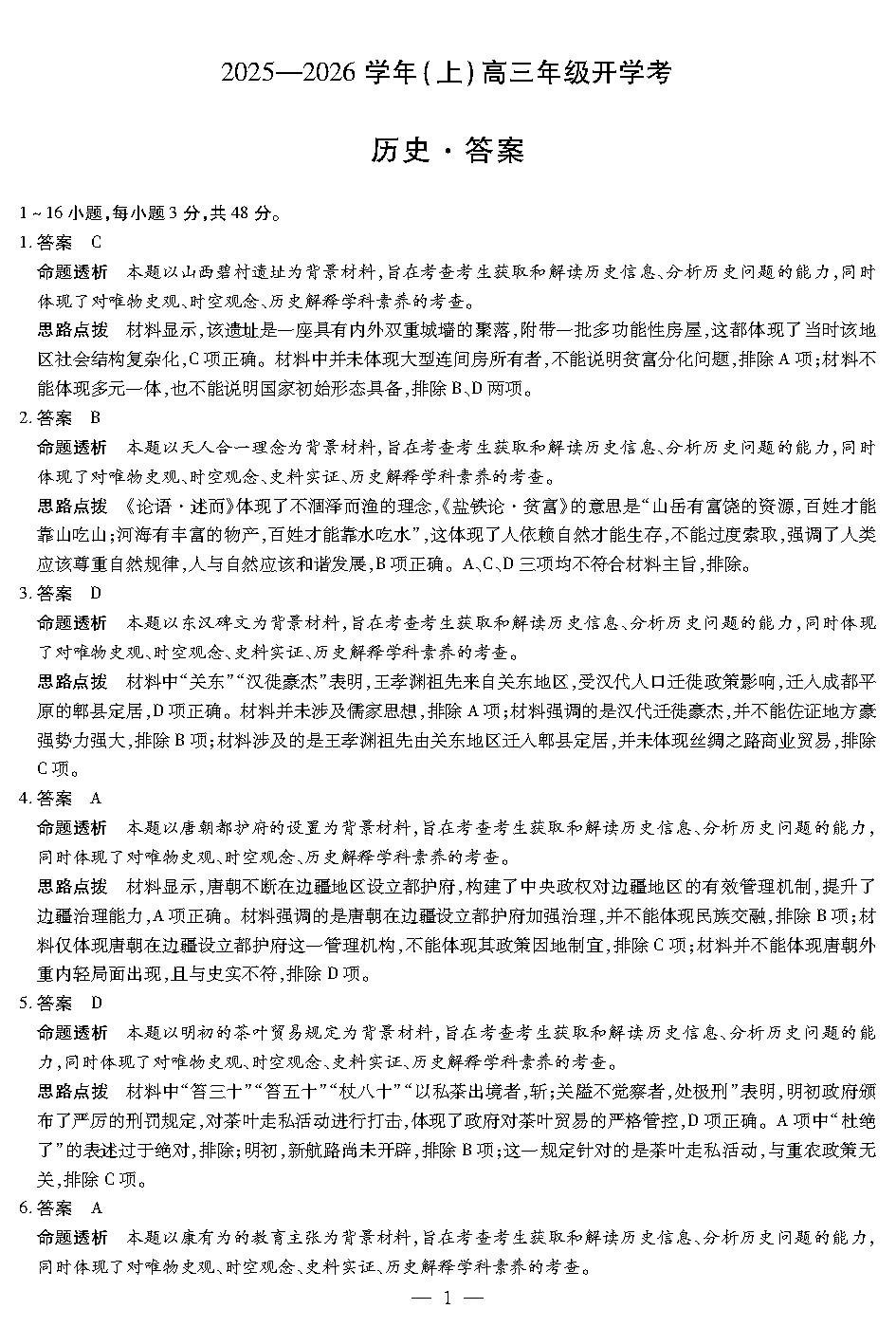 河南天一大联考2025-2026学年高三上学期开学考历史考试已于近日开考,为方便考生考后及时查看考试情况,查漏补缺、弥补不足,本文整理了试题答案解析相关信息!