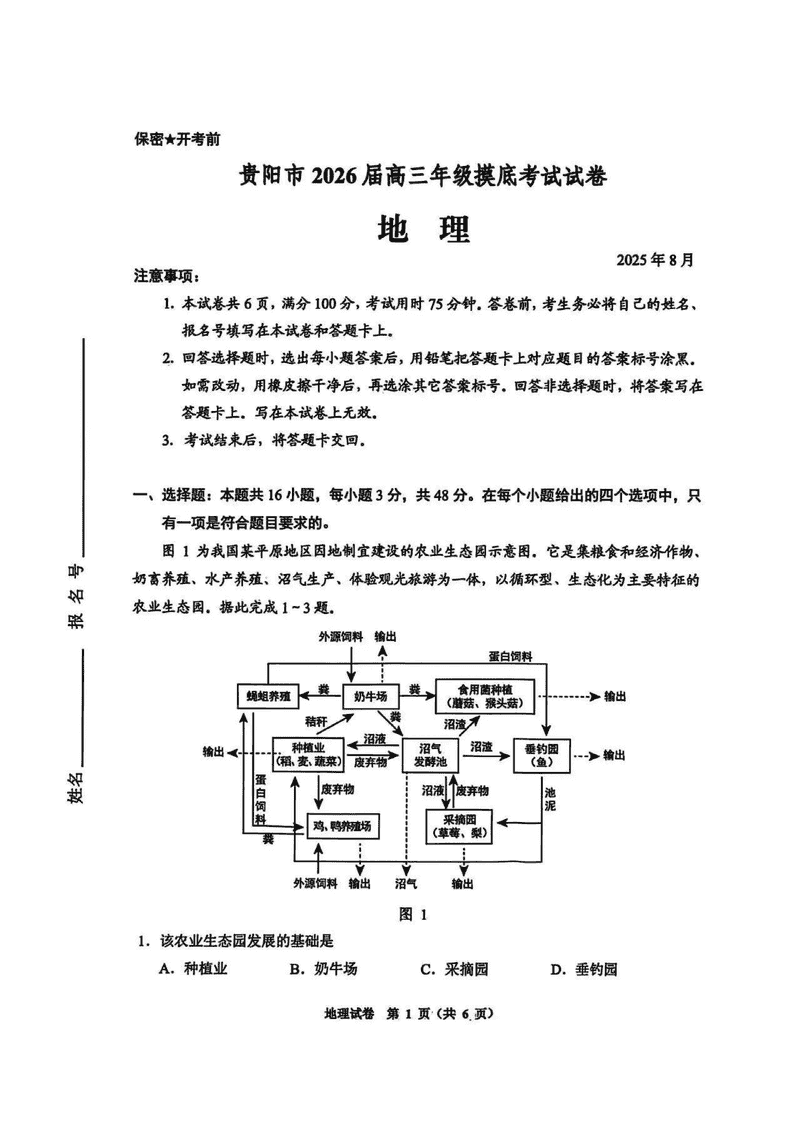 贵阳市、铜仁市2026届高三9月摸底考地理试题及答案