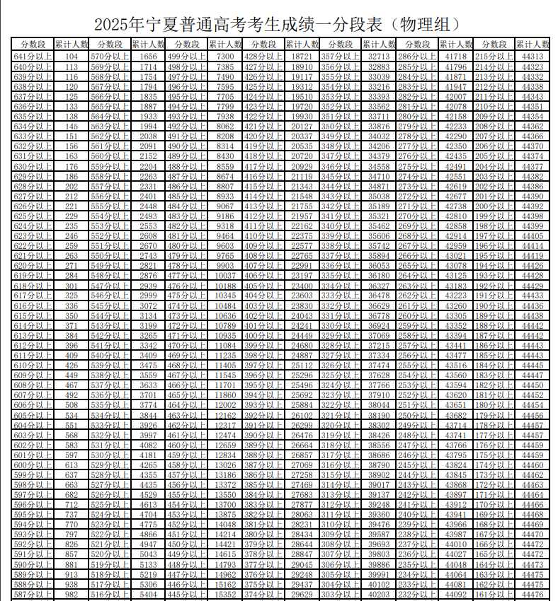 宁夏物理类一分一段表