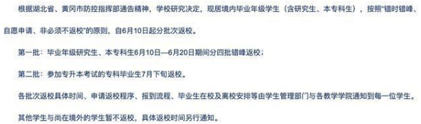 湖北省又有一批高校明确开学时间,黄冈师范学院开学时间定了!现居境内毕业年级学生(含研究生、本专科生),按照“错时错峰、自愿申请、非必须不返校”的原则,自6月10日起分批次返校。