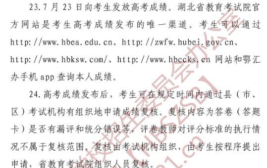 湖北省高等学校招生委员会关于做好2020年普通高等学校招生工作的通知发布,其中湖北高考查分时间是7月23日。
