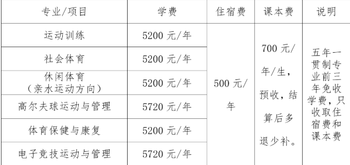 2020年海南体育职业技术学院学费收费标准为:运动训练5200元/年,社会体育5200元/年,休闲体育5200元/年,高尔夫球运动与管理5720元/年,体育保健与康复5200元/年,电子竞技运动与管理5720/年;住宿费均为500元/年;教材费按学年实际使用情况收取。