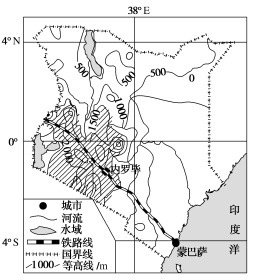茶树性喜温暖湿润气候,生长最适温度为20~25 ℃,年降水量要在1 000毫米以上,喜光耐阴,要求排水良好的砂质壤土。肯尼亚地处东非高原,东非大裂谷纵贯南北,火山灰土层深厚,河湖较多,自然条件非常适合茶树的生长。肯尼亚茶园主要分布在海拔1 500~3 000米的西南部山区,与世界其他地区的茶叶相比,这里的茶叶品质优良,产量大,是本国第一大出口农产品,主要出口到欧洲、中东及美洲地区。肯尼亚茶叶在国际市场上销售方式独特,主要采用生产者(茶农)—拍卖行—消费者(食客)的拍卖体系。肯尼亚90%的茶叶都是通过拍卖市场进行售卖的,位于蒙巴萨的茶叶拍卖市场是世界三大(印度加尔各答拍卖市场、斯里兰卡科伦坡拍卖市场)茶叶拍卖市场之一,为降低茶农销售成本,肯尼亚政府每周都免费为茶农将茶园的茶叶用火车运到蒙巴萨茶叶拍卖市场。肯尼亚茶叶虽然品质优良,但一直没有大规模进入我国市场。如图为肯尼亚等高线地形图(斜线阴影区为茶树种植区)。