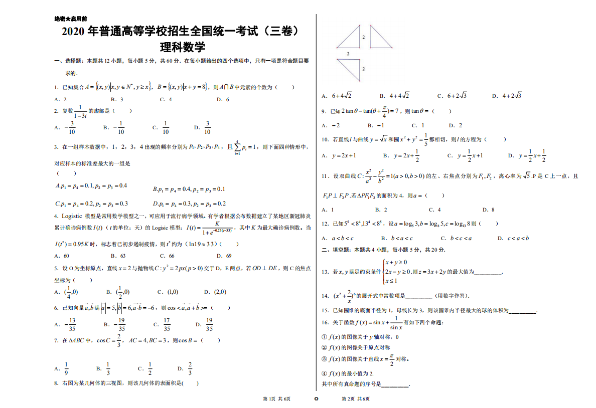 2020年高考全国3卷理科数学试题 【图片版】 时间:2020-07-08 10:33 数学试题 随着高考数学的结束,想必大家对于高考数学试题也是非常关注,下面小编为大家搜集整理了2020高考全国3卷理科数学试题,供大家参考。2020全国3卷理科数学试题上述试题来源:辰轩学府