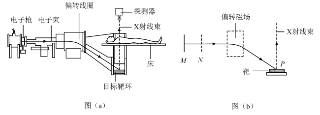 17.CT扫描是计算机X射线断层扫描技术的简称,CT扫描机可用于对多种病情的探测。图(a)是某种CT机主要部分的剖面图,其中X射线产生部分的示意图如图(b)所示。图(b)中M、N之间有一电子束的加速电场,虚线框内有匀强偏转磁场;经调节后电子束从静止开始沿带箭头的实线所示的方向前进,打到靶上,产生X射线(如图中带箭头的虚线所示);将电子束打到靶上的点记为P点。则