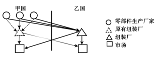 自20世纪90年代,在经济全球化浪潮下,一些国家之间签订自由贸易协定,降低甚至取消彼此间部分商品的贸易关税,促进商品的自由贸易。图1示意汽车企业在已签订自由贸易协定的甲、乙两国的产业布局调整。据此完成1—3题。