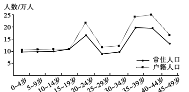 户籍人口与常住人口的差值可以表示当地人口常年(半年以上)外出的数量。图2显示2010年我国西部某市50岁以下各年龄组女性人数。调查表明,该市妇女生育峰值在21—29岁。据此完成4—6题。
