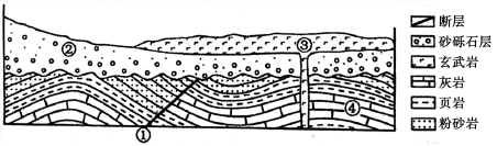 图3示意某地质剖面,其中①指断层。据此完成7~8题。