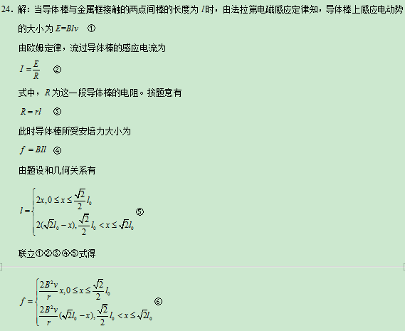 如图,一边长为l0的正方形金属框abcd固定在水平面内,空间存在方向垂直于水平面、磁感应强度大小为B的匀强磁场。一长度大于√2l0的均匀导体棒以速率v自左向右在金属框上匀速滑过,滑动过程中导体棒始终与ac垂直且中点位于ac上,导体棒与金属框接触良好。已知导体棒单位长度的电阻为r,金属框电阻可忽略。将导体棒与a点之间的距离记为x,求导体棒所受安培力的大小随x(0≤x≤√2l0)变化的关系式。