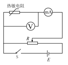 已知一热敏电阻当温度从10 ℃升至60 ℃时阻值从几千欧姆降至几百欧姆,某同学利用伏安法测量其阻值随温度的变化关系。所用器材:电源E、开关S、滑动变阻器R(最大阻值为20 Ω)、电压表(可视为理想电表)和毫安表(内阻约为100 Ω)。