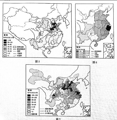 图6:人口密度最高的地区在长江下游地区(江浙地区)。这与明初政治中心在南京,南方经济发达的状况相吻合。据此判定图6为明代(洪武二十六年)。