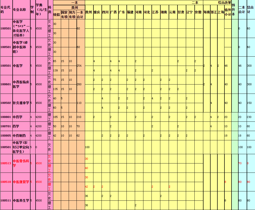 贵州中医药大学招生计划及人数