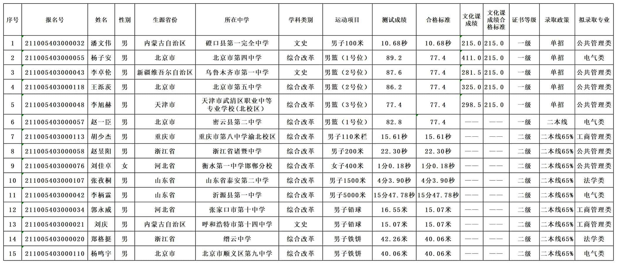 北京林业大学2021年高水平运动队(田径)合格名单公示