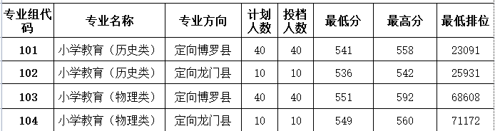 惠州学院2021年广东省提前批本科教师专项投档分数(小学教育)